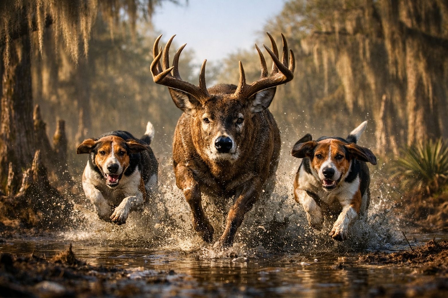 Hounds Chasing Buck in Swamp